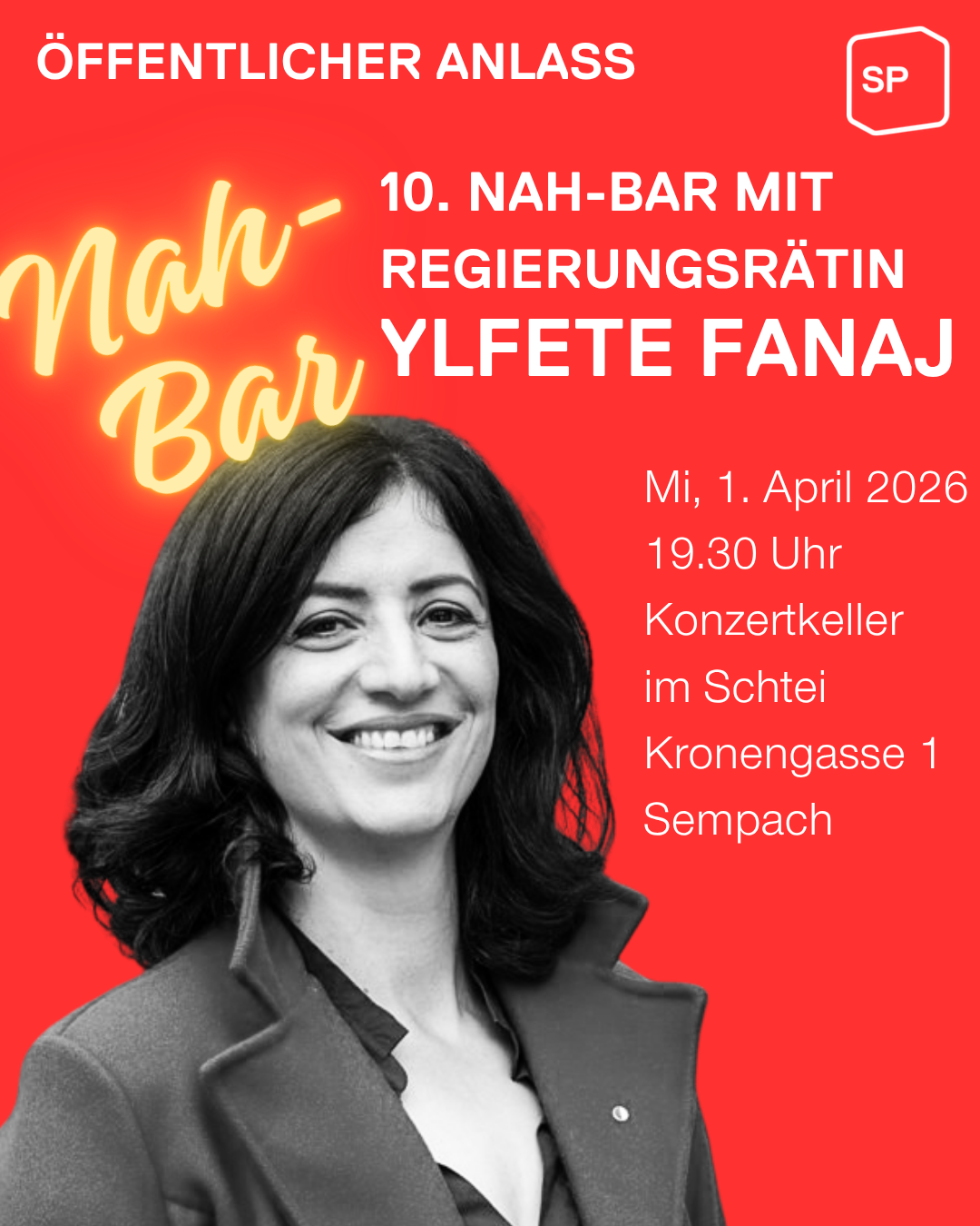 Nah-Bar mit Regierungsrätin Ylfete Fanaj. Ylfete Fanaj berichtet von ihrer Arbeit als Regierungsrätin und steht für Fragen und Diskussionen zur Verfügung.